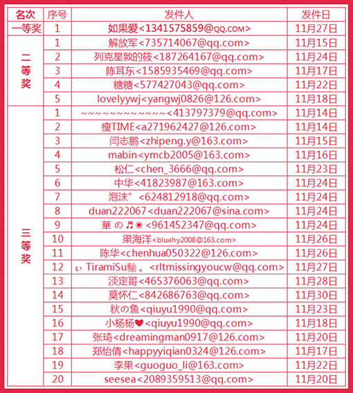 看到本公告后,未發(fā)送過個(gè)人詳細(xì)信息的中獎(jiǎng)?wù)撸?qǐng)于12月12日前把個(gè)人信息(真實(shí)姓名、詳細(xì)地址、聯(lián)系方式)發(fā)送至郵箱: cxy@china-jado.com ,以便我們能及時(shí)把獎(jiǎng)品寄出,逾期未發(fā)送者視為放棄獎(jiǎng)品。