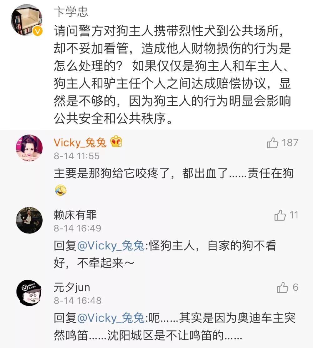 隨后,一位目擊者又提供了另外一種說法,“奧迪車先按喇叭鳴笛了,狗才跑到馬路上的。狗可能也受驚嚇了。 ”